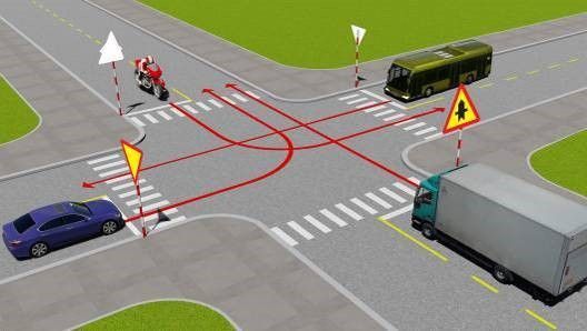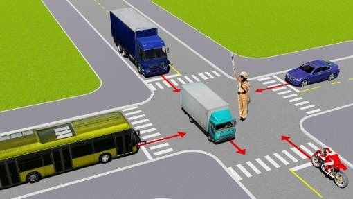 Câu 489: Theo hướng mũi tên, thứ tự các xe đi như thế nào là đúng quy tắc giao thông?