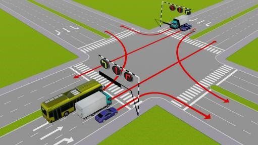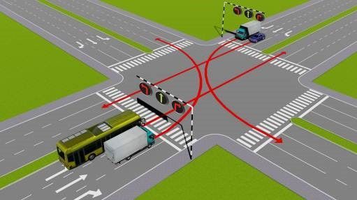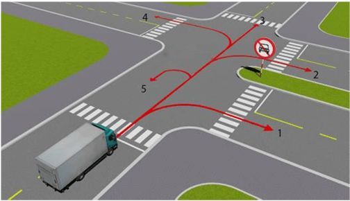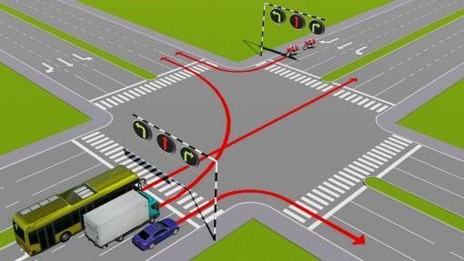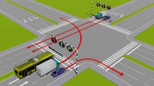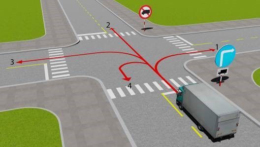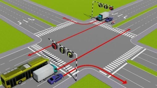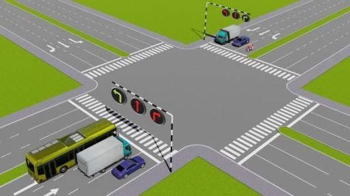Câu 502: Theo tín hiệu đèn, xe tải đi theo hướng nào là đúng quy tắc giao thông?