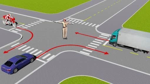 Câu 499: Theo tín hiệu đèn, xe nào được phép đi?