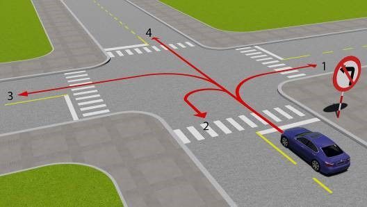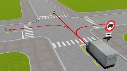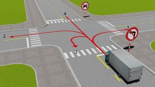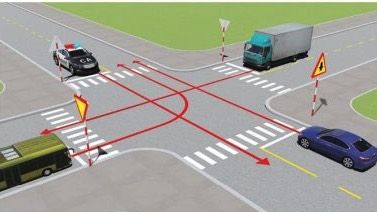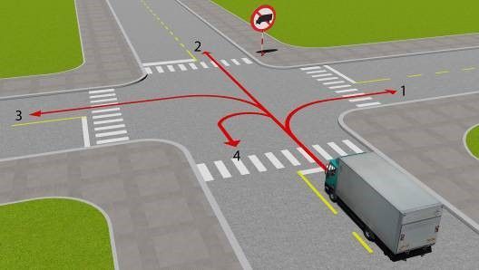Câu 514: Theo hướng mũi tên, gặp biển hướng đi phải theo đặt trước ngã tư, những hướng nào xe được phép đi?