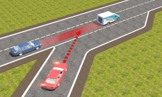 Câu 597: Trong tình huống dưới đây, xe con màu đỏ nhập làn đường cao tốc theo hướng mũi tên là đúng hay sai?