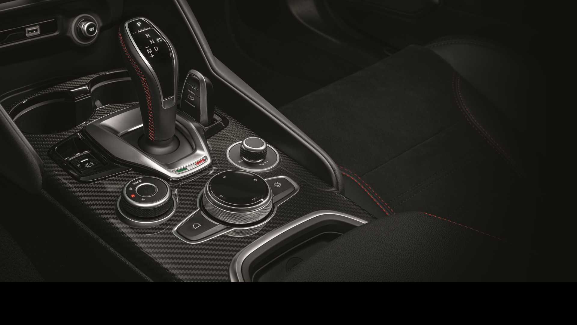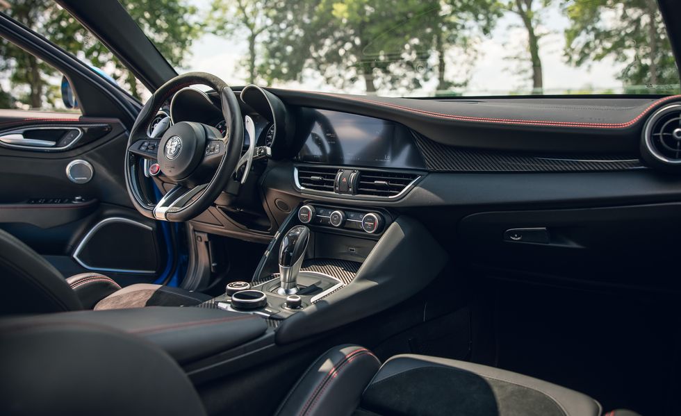 Bảng điều khiển chuyển mạch và bảng điều khiển sà xuống mang phong cách của Giulia thông thường. Nhưng Quadrifoglio 2021 bổ sung thêm nhiều chi tiết trang trí bằng sợi carbon. Cốp sẽ chứa được bốn va li xách tay, mức trung bình cho hạng này. Bảng điều khiển trung tâm có kích thước hợp lý. Bổ sung thêm một chỗ để đồ cho hàng ghế trước. Hành khách ở hàng ghế sau bị hạn chế với các túi nhỏ ở cửa. Và lưới chở hàng ở mặt sau của hàng ghế trước để chứa đồ của họ.