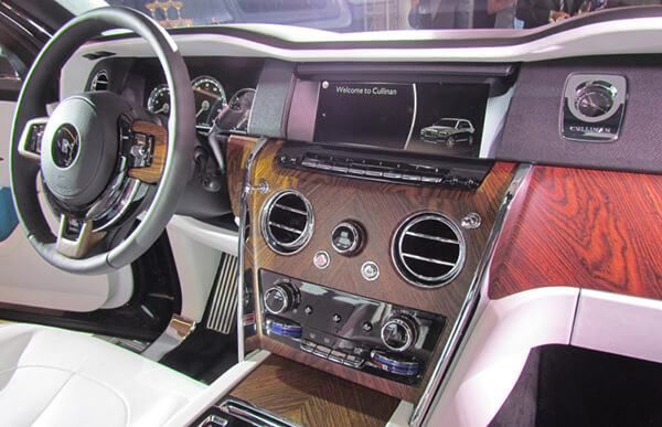 Táp lô của xe có thiết kế tối giản nhằm giành nhiều không gian cho các loại chất liệu cao cấp như da và gỗ quý. Chỉ những mảnh gỗ có đường vân thuộc dạng “hiếm có” mới vinh dự được Cullinan sử dụng.