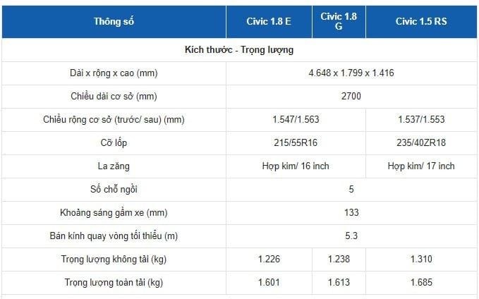 | Giá xe Honda Civic 2020 Niêm Yết từ Honda | ||