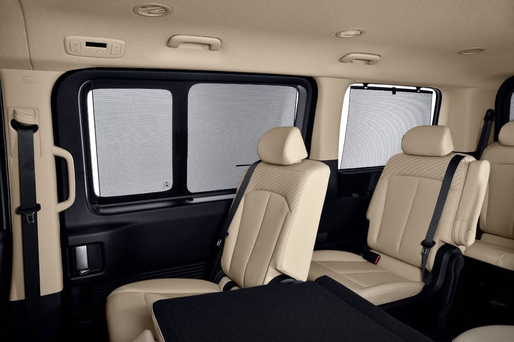 Bên trong Hyundai Staria 2021 là không gian nội thất cũng lấy cảm hứng thiết kế từ phi thuyền. Tại thị trường Thái Lan, mẫu xe này có những trang bị đáng chú ý như bảng đồng hồ kỹ thuật số với màn hình 10,25 inch, màn hình cảm ứng 8 inch của hệ thống thông tin giải trí, hỗ trợ kết nối điện thoại thông minh qua Apple CarPlay/Android Auto, sạc điện thoại thông minh không dây và nút bấm chuyển số.
