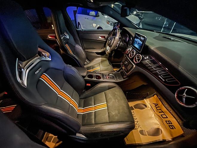 Nội thất xe vẫn rất sang trọng và thể thao đậm chất Mercedes-Benz. Hãng quan niệm một chiếc xe dù được nhấn mạnh vào tính thể thao nhưng cũng không đáng bị ăn bớt các trang thiết bị sang trọng. Cabin tràn ngập da cao cấp và các chi tiết bằng kim loại: bộ ghế thể thao bọc da và vi sợi Dinamica, bảng táp-lô bọc Artico, chỉ khâu màu cam đối lập và biển tên “AMG OrangeArt Edition”. Bên cạnh đó, dàn loa Harman Kardon hứa hẹn sẽ thỏa mãn những đôi tai khắt khe của tín đồ âm thanh.